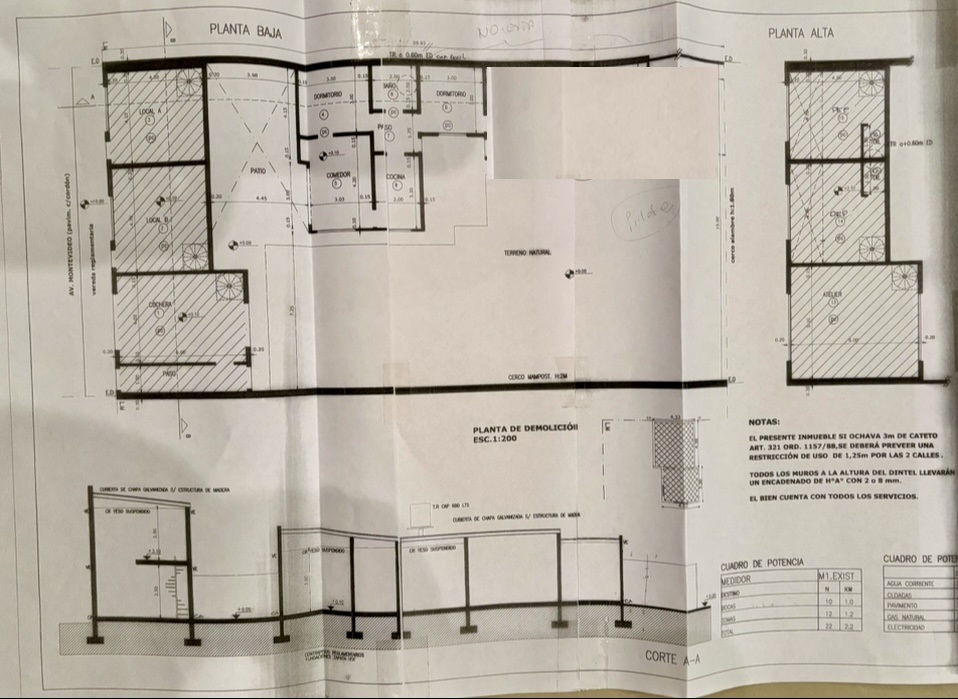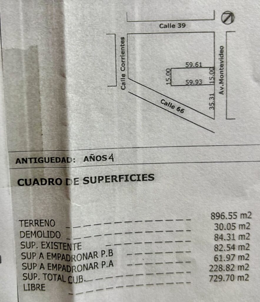 El bien se encuentra edicado sobre lote que mide 15 metros de frente por 59,93 mts. de fondo el que se comunica con lote que mide 22,31 mts. con frente a calle sin nombre por 14,39 mts de fondo.